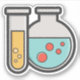 Vinheta de contorno com uma ilustração fofinha de um tubo de ensaio com um líquido amarelo e um balão/copo arredondado com um líquido verde com bolhas vermelhas.
