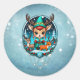 Um belo estilo de desenho animado rende elfo com cabelo vermelho e olhos grandes. Ela veste uma fantasia de elfo verde e vermelho com um chapéu pontiagudo e está cercada por duas renas menores. O fundo é uma cena de inverno esbranquiçada com neve, pinheiros e um céu noturno estrelado. Este design bonitinho vai te deixar no humor para a época de Natal