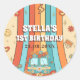 Um adesivo circular clássico com primeiro aniversario retrógrado retrógrado do arco-íris