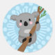 Um urso coala giro pendurado num galho. Fundo azul com bolinhas para um toque caprichoso.