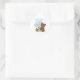 Design de primeiro aniversario do Urso de Teddy com balões azuis e cor-de-rosa, um número um, e texto azul que diz "Olha quem é 1"!
