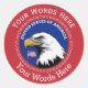 Este autocolante redondo personalizado é decorado com uma cabeça BALD EAGLE, a bandeira dos EUA, rodeada pelas palavras Estados Unidos da América e 50 estrelas. Ele pode ser personalizado acima e abaixo com palavras de sua escolha.