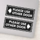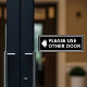 Procurando uma maneira educada de dirigir o tráfego de pés em sua empresa? Não olhe mais que este sinal preto "Por favor, use outra porta" com um adesivo de vinil de seta definido! Estes autocolantes versáteis podem ser colocados em qualquer porta ou janela e devem transmitir a sua mensagem sem qualquer confusão. O texto branco brilhante e a seta são fáceis de ver, mesmo à distância. As mensagens neste conjunto de adesivos podem ser personalizadas.