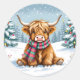 Este bonitinho adesivo de Natal tem uma ilustração do estilo aquarela de um bebê Highland Cow sentado num campo de neve balbuciosa durante um dia de inverno com um pano de fundo de pinheiros decorados em férias.