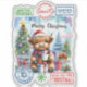 Uma vaca de cartoon Highland vestindo um chapéu de Papai Noel e um cachecol se senta perto de uma árvore de Natal decorada com ornamentos. A vaca está segurando uma caneca de chocolate quente.
