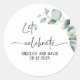 Vamos celebrar com nomes personalizáveis e datar um adesivo redondo moderno e minimalista. O texto "Vamos Celebrar" está numa letra moderna com glifo. O autocolante tem uma ramificação de eucalipto no lado direito "enquadrar" no texto. Use este adesivo como parte da coleção de Casamentos ou mude o texto para sua ocasião, ex. Aniversário, aniversário ou outro. Adicione ao seu correio ou a um saco de presentes quando seu convidado estiver chegando à Respeição ou festa. Se quiser Personalizar mais (tipo de fonte, tamanho e cor) - você pode fazer essa dentro da Ferramenta design. Disponível em diferentes tamanhos e formas.