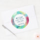 Etiquetas para empresas de velas ou sabão com um design legal e na moda abstrato. As aquarelas se misturam e se misturam para criar a ilusão de uma imagem espacial. Verde com espirais de púrpura, amarela e vermelho-claro misturados com uma mistura de pontos brancos e estrelas. Uma criação artística elegante. Um círculo branco colocado sobre o topo com a sua dentro de texto.