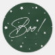 Um elegante e moderno "Boo!" Vetor adesivo/envelope do Halloween com guião branco manuscrito e estrelas dispersas contra um fundo verde ligeiramente angustiado. Funciona em formas adesivas redondas ou quadradas. Disponível em outras cores e na coordenação de convites e acessórios.