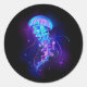 Large, blue, artistically drawn, glowing, bright jellyfish, with long tentacles on black background with purple bioluminescence. Luminous jellyfish.
