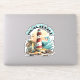 Adesivos praianos. Ilustração de uma cena praiana com farol, pranchas de surfe, palmeiras e golfinho.
