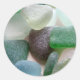 Apresenta uma foto de alguns belos pedaços de vidro azul e verde do mar encontrados ao longo da praia.