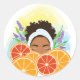 Este design de adesivo apresenta uma mulher graciosa cercada por tangerinas frescas e flores de lavanda macia, simbolizando a beleza e a calma. Perfeito para clientes de beleza, combina elegância com um sentimento natural e refrescante.