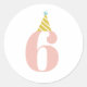 Um adesivo de aniversário de criança moderno e divertido, com uma grande era personalizável, com um chapéu de festa distribuído.
