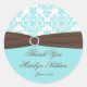 Este adesivo de 3" de diâmetro aqua azul, marrom e casamento tema damasco branco corresponde ao convite de casamento mostrado abaixo. É grande o suficiente para você se anexar aos seus favores de casamento, ou você pode dimensioná-lo até o tamanho de 1,5" e usá-lo para selar suas cartas de agradecimento. Há também postagem correspondente para permitir que você envie um pacote perfeitamente coordenado. Você pode mudar o texto para dizer o que quiser. Se você precisar de outros itens correspondentes neste design, envie um e-mail com sua solicitação.
