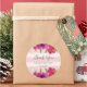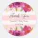 Adesivo redondo para favor do chá de fraldas com rosas cor-de-rosa de fúchsia e fundo de listras cor-de-rosa pinceladas.