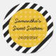 Um adesivo de favor moderno e atraente. Este rótulo é ideal para um tema de estrela de cinema de Hollywood. O fundo tem um padrão de estrelas ouro com uma borda de listras preta e branca. Design de diversão para uma garota carismática com senso de glamour. Use-o para favoritos para festas ou selar envelopes.
