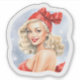 Um adesivo de inspiração retrorreflectora encantador com uma mulher glamourosa com cabelos loiros fluentes adornada com uma fita vermelha vibrante.