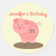 Um adesivo de festa de aniversário que ilustra um porco rosa parado numa poça de lama. Personalize o texto rosa e marrom. Procure convites correspondentes e mais na categoria "Aniversários" da Paperie de Jill.