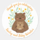 Uma mamã e um urso bebê doçamente ilustrados são flanqueados por folhas verdes de menta e flores amarelas ensolaradas para parecerem alegres neste adesivo de chá de fraldas personalizado perfeito para qualquer necessidade de decoração de festas.