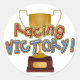 Um adesivo brilhante de troféu de ouro, com gráficos de um troféu de forma dourada. Texto gráfico colorido, através das leituras do meio, Racing Victory. Perfeito como favores de festa de aniversário ou adesivos de prêmio para a festa de aniversário do garoto temido de um carro de corrida.