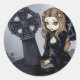 Condenado desde o início - seguramente uma história trágica por trás desta. Uma bela, mas triste, fada gótica com cabelo de ouro chora ao lado de uma pedra Celta cruz. Minha própria pintura acrílica original.