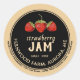 Morangos estilizados a preto com borda kraft; data e ingredientes