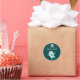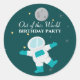 O adesivo de festa de aniversário deste rapaz fofo tem um fora deste tema espacial mundial! O fundo tem uma cor verde escura com muitas estrelas amarelas, brancas e cinzas no fundo. Há um astronauta no fundo com uma lua no topo. Fora desta Festa de aniversário do Mundo está escrita no meio.