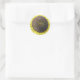 Esta bela folha de adesivos redondos apresenta uma fotografia detalhada de um girassol amarelo bonito. A fotografia foi tirada usando macrofotografia e mostra um belo contraste entre as pétalas amarelas pálidas e a grande cabeça de semente central escura da flor.