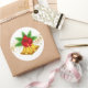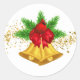 Este autocolante redondo de grande tamanho é mostrado com um sinos de ouro festivo de Natal e impressão de ave cardeal. Personalize este item ou comprar como está.