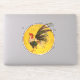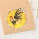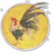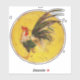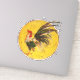 Galo que luta antes de um sol amarelo. Cockscomb é vermelho vivo, penas são tons de verde e laranja. Arte cerâmica original de Nora Chen.
