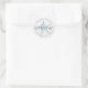 Os autocolantes redondos "bem-vindos" com uma ilustração de peixe-estrela de safra azul-mudada e o fundo de madeira de cinza rústica com nomes personalizados e data de casamento é perfeito para personalizar bolsas de boas-vindas e favores de casamento para um casamento de destino de praia.