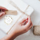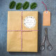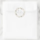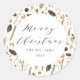 Um adesivo na moda de Natal moderno e elegante com uma delicada citação suave "Feliz Natal" e textos personalizados em círculo branco simples. O seu fundo é um padrão de bolo de aquarelas botânico, folhagem, pínus cones, pinheiros, bagas e algodão, dando uma vibração aconchegante e víbora de cabana de cabana.