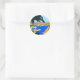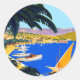 Anúncios de Viagem, em francês e europeu, em língua oficial - Praia, aldeia, pessoas, árvores, mar azul e ilustração do céu