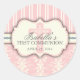 Um design de damasco e listras em um esquema de cor rosa e creme macio e feminino. Com uma cruz de coordenação, é apropriado para qualquer celebração sacramental, e cada área de texto é personalizável. Faz um belo selo de envelope ou adesivo de favor para a Primeira Comunhão da sua filha, Christening ou Confirmation.