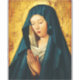 O fundo comum e escuro contrasta com a cabeça radiante da Virgem e com a morada branca que a cobre, e as mãos dela são cuidadosamente fechadas.