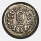 A figura humana rodeada por letras. Moeda de ouro do século VII, utilizada por Visigoths na Espanha.