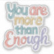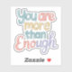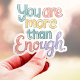 Este adesivo inspirador é um lembrete lindo do seu valor e mérito inerentes. Com a frase empoderadora "Você É Mais do que Suficiente" em uma fonte divertida, este adesivo é uma maneira perfeita de aumentar a autoestima e espalhar positividade. Feito com vinil durável, este adesivo é ótimo para laptops, garrafas de água, diários, espelhos e muito mais. Compartilhe esta mensagem de amor próprio consigo mesmo e com os outros!