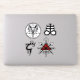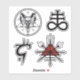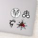 Incluem-se quatro autocolantes. São, de cima à esquerda para baixo: Pentagrama de Baphomet; o símbolo do enxofre usado na alquimia; sigil do demônio Mestama, o patrono de bruxas, passas e viúvas vingativas; e o sigilo do poder antinômico. Use estes adesivos onde quiser melhorar o seu Halloween, Wicca ou a sua vibração estética escura.