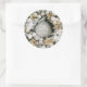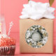 O adesivo redondo apresenta uma bela coroa de pinheiros com neve, decorada com ornamentos de árvores de Natal brancas e douradas e flores com uma saudação e o seu nome ou nome de empresa no meio. CORRESPONDENTE a itens na nossa coleção.