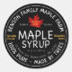 Folha de bordo vermelha realista com detalhes morfológicos sobre fundo preto. "Xarope de maple" escrito em texto branco de quadro de correspondência. Lembre aos seus clientes que o xarope de bordo é um produto natural "100% puro - feito por árvores". Adicione seu nome ou nome comercial, classe de xarope, peso líquido em onças fluidas e mililitros e endereço nesta etiqueta compatível com FDA.