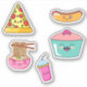 5 adesivos cortados com estilo Kawaii de pizza, cachorro quente, bolo de xícara, macarrão ramen e uma bebida. Cada imagem se destaca separadamente. Ótimo para diários de rabiscos, scrapbooking e marketing de restaurantes.