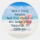 Selos de envelope de endereço de devolução redondos com imagem de bebidas na praia. Qualquer pessoa que viva um estilo de vida casual e à beira-mar vai adorar este adesivo. Coquetéis gelados estão sentados em uma praia ensolarada com água azul tropical ao fundo. Esta é a imagem de fundo para o seu nome e endereço que é impresso em estilo manuscrito grosso. Outras formas de adesivos podem funcionar dependendo do seu texto. Não deixe que nenhuma palavra se aproxime da borda.