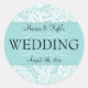 Os adesivos de casamento com uma borda de renda, fundo azul.