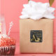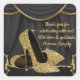Adesivos de favor de festa de aniversário de sapatos pretos e dourados de mulher com sapatos de salto alto dourado brilhante em um fundo de cortina preta e dourada. Este adesivo de festa de aniversário preto e dourado é facilmente personalizado para sua festa ou evento adicionando seu texto.