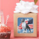 Um orgulhoso touro azul e branco Pit (American Staffordshire Terrier) em frente a uma bandeira americana ondulando e ao céu azul.