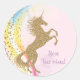 Adesivos de unicórnio com lindo unicórnio dourado em um fundo espiral de arco-íris. Você pode personalizar facilmente esses adesivos de unicórnio para o seu evento, simplesmente adicionando o texto de sua escolha. Você também pode alterar a cor do fundo. Este é um design impresso sem brilho real.