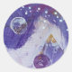 Luares e estrelas pairam sobre uma montanha nevada em um mundo abstrato.