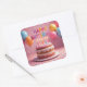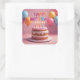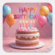 Um bolo de aniversário com velas tremeluzentes, balões coloridos, confetes e um letreiro de FELIZ ANIVERSÁRIO cobre este adesivo de festa.