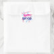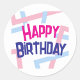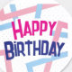Um adesivo de aniversário colorido com as palavras "Parabéns em letras negrito.