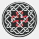 Um conjunto de adesivos redondos com um design de nó Celta com uma cruz quadrada vermelha no centro.